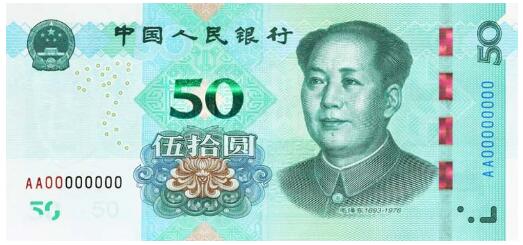 2019年版第五套人民币50元、20元、10元、1元纸币调整正面毛泽东头像、装饰团花、横号码、背面主景和正背面面额数字的样式,增加正面左侧装饰纹样,取消正面右侧凹印手感线和背面右下角局部图案,票面年号改为“2019年”。