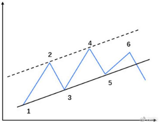 此外,我们还可以利用管道技术来辨别趋势减弱的信号,这就是价格无力抵达管道线的情况。在图6中,价格无力达到管道的顶部(5点),这就是趋势即将有变的警讯,显示另一条线(基本的上升趋势线)被突破的可能性有所增加。