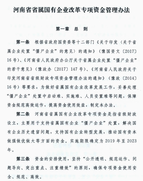 据了解,河南省省属国有企业改革专项资金是指省级财政设立,主要用于支持省属国有企业“僵尸企业”处置,解决国有企业历史遗留问题,支持国有企业转型发展,推动国有资本做强做优儆大等方面的资金。实施期限确定为2019年至2023年。